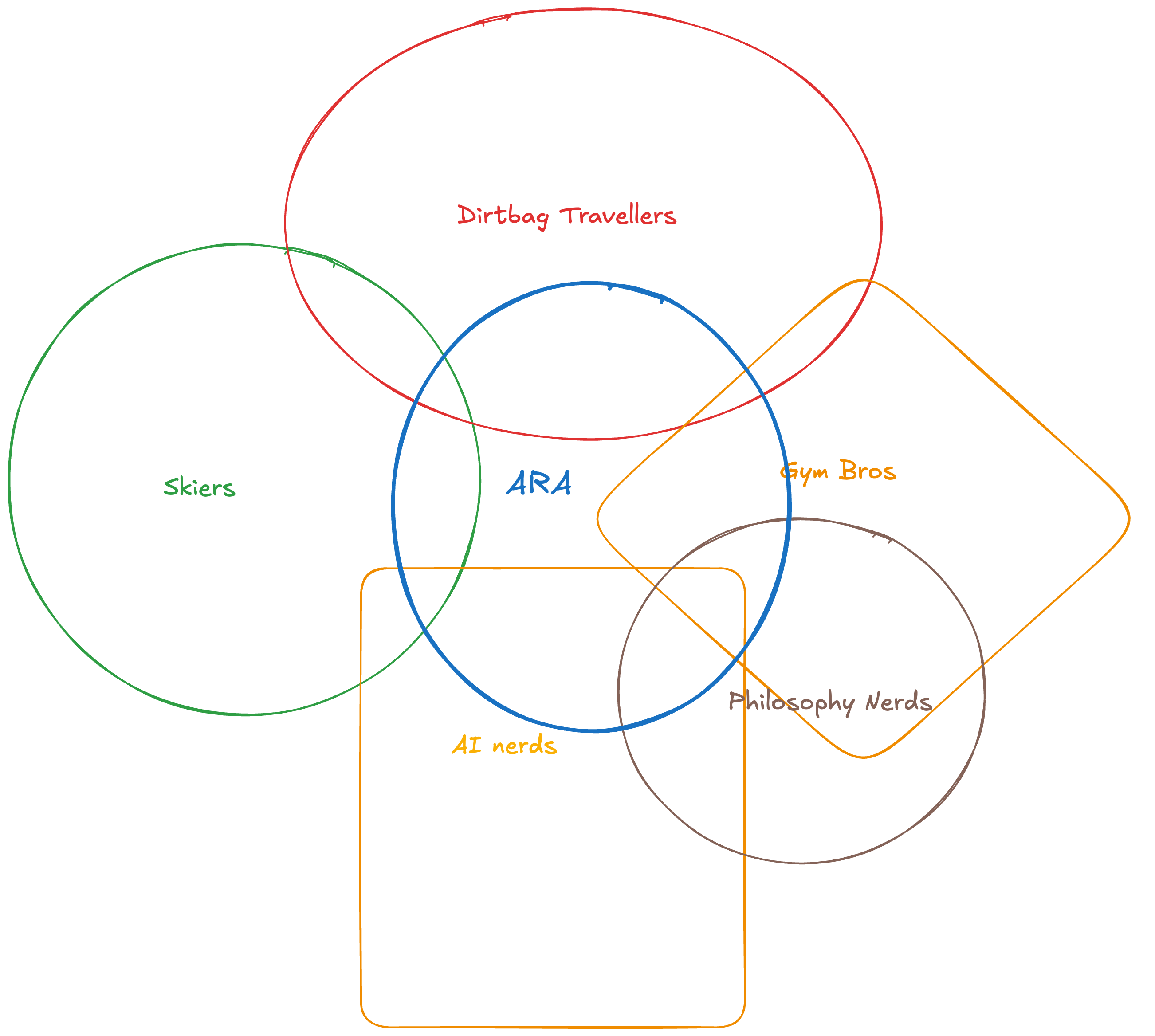 So for my case: One circle is the dirtbag travelers who spend every spare dollar getting to the middle of nowhere. The second circle is a circle of skiers and snowboarders. The third circle is the people who spend 14 hours a day grinding to optimize AI models. Maybe there’s a fourth circle for gym bros, and a fifth for philosophy/art nerds who obsess about why brutalist architecture is a crime against humanity.