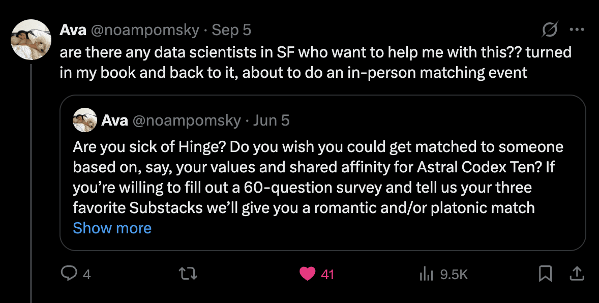 At the same time, it hit me that so many people in this discourse of matchmaking have perverse incentives. Every single day, yet another dating app just wants you to pay more to keep coming back. They have very little interest in you actually getting married. I made a vow to get nothing out of it, that’s the only way this could ever really work. I want to do it right.