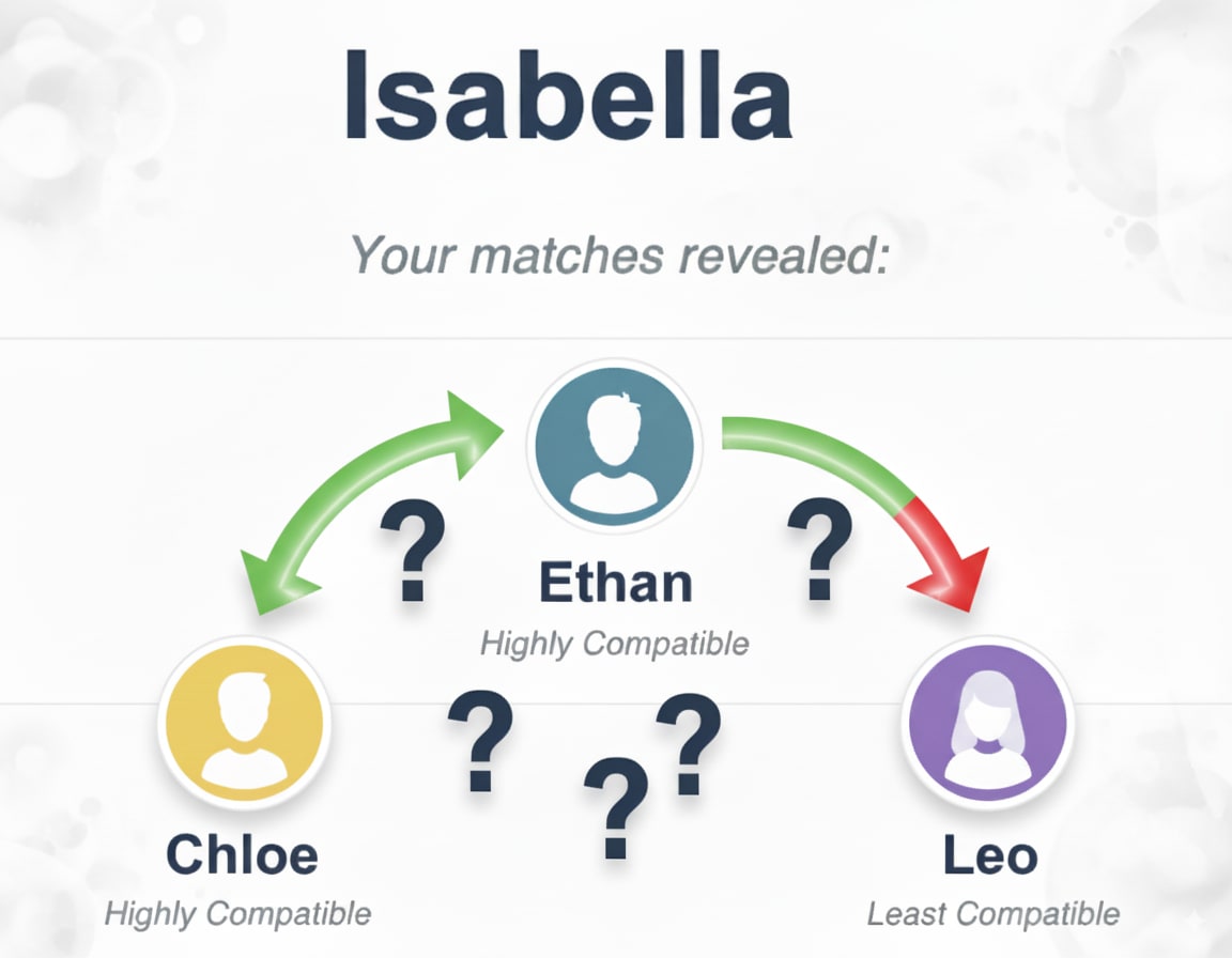 The cards looked like this(name changed). The idea was that everyone was going to be matched with: Two people they really liked and were highly compatible with One person they were least compatible with We were now going to tell you which is which.